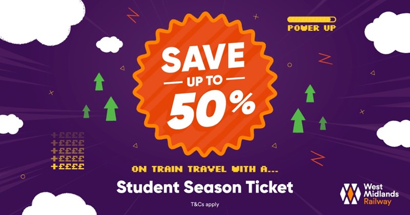 Save up 50% on train travel for the whole term with West Midlands Railway.